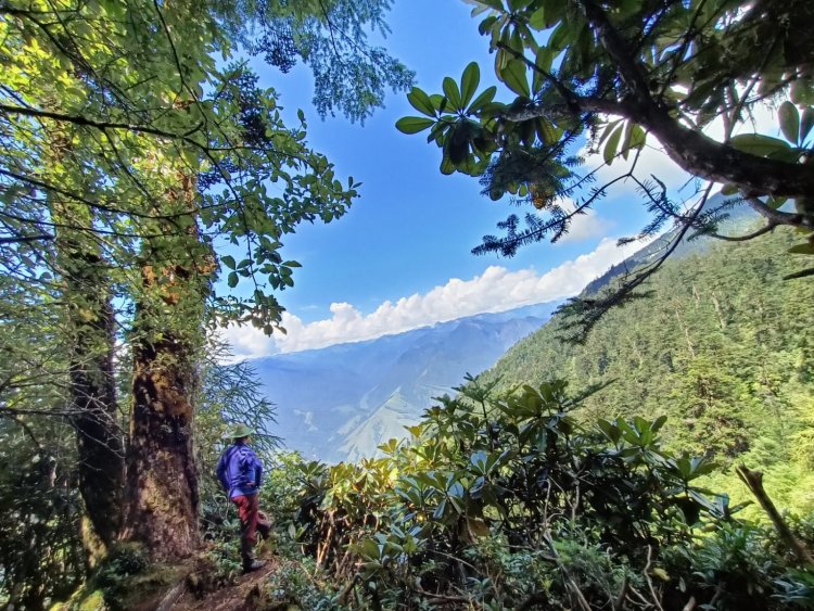 From here the trail was through Himalayan pine, Rhododendron, walnut, oak, and chestnut forest. The lichen, the dense green clumps of moss-grown profusely on the bark of trees and bamboo thickets. We were cautioned about the venomous Bosombo, vipers, and black bears on the prowl. I could even see a few fresh and old scats of cats on the trail.